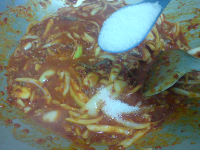 masukkan gula sikit je, nanti terlalu manis pulak.buat syarat je supaya tak pedas sangat.
